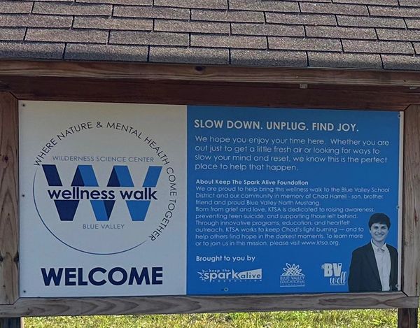 Located at Blue Valley's Wilderness Science Center, the Wellness Walk was first created in 2022. Keep The Spark Alive Foundation worked with Blue Valley Education Foundation to create a place where visitors could immerse themselves in nature, slow down, and find joy in their surroundings.