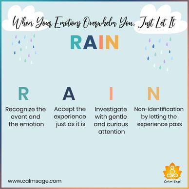 The acronym RAIN is an easy-to-remember tool for practicing mindfulness and compassion using four steps: Recognize what is happening; Allow the experience to be there, just as it is; Investigate with interest and care; Nurture with self-compassion.